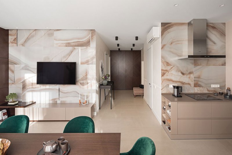 Киевская квартира 83 кв. метра не предназначалась для постоянного проживания. Заказчики, молодая семейная пара, хотели получить пространство выходного дня, куда можно приехать с друзьями или родными, устроить праздничный обед, сесть за большой стол и проговорить до утра. Вести проект пригласили студию V.Concept.