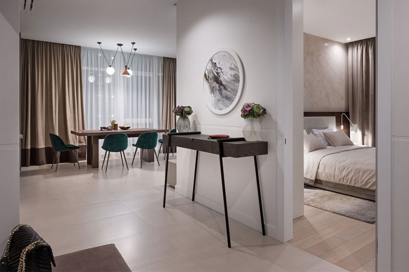 Дизайнеры сразу решили, что интерьер должен быть максимально уютным, легким, не давящим на хозяев и гостей. В основу концепции легла функциональность. По желанию заказчиков, в квартире выделили две полноценные спальни, каждая со своим санузлом, и очень просторную общую зону с гостиной, столовой и кухней, в которой всегда много света и воздуха.