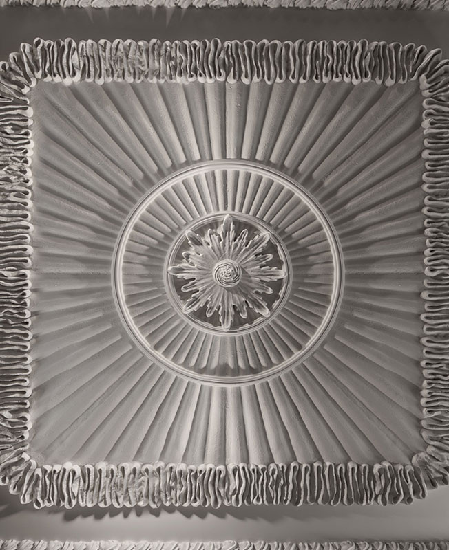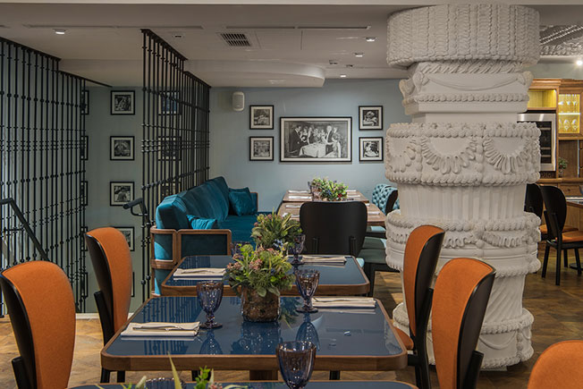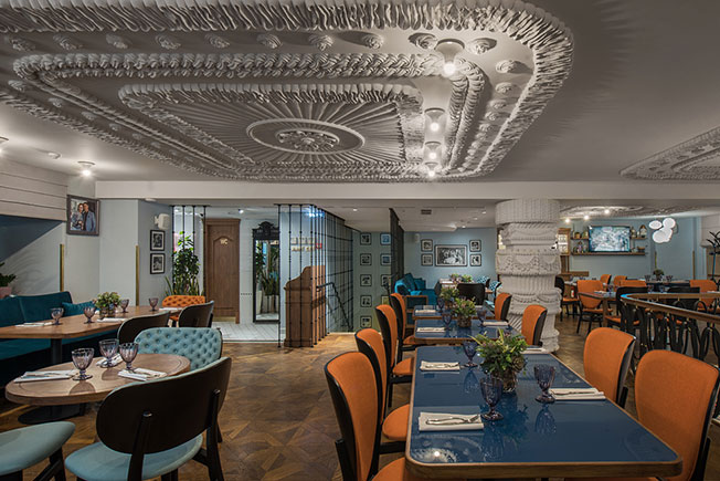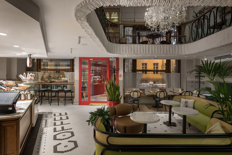 Пол в отделке пятиугольной черно-белой плиткой плиткой также зонирует помещение: перед витриной с пирожными выложена надпись Cakes, перед барной стойкой — Bar и т.д. Второй этаж напоминает камерный ресторанный зал. Объединяет два уровня масштабная люстра, апеллирующая к прошлому здания — Доходному дому княгини Марии Ливен, построенном архитектором Семеном Барковым в начале XX века.