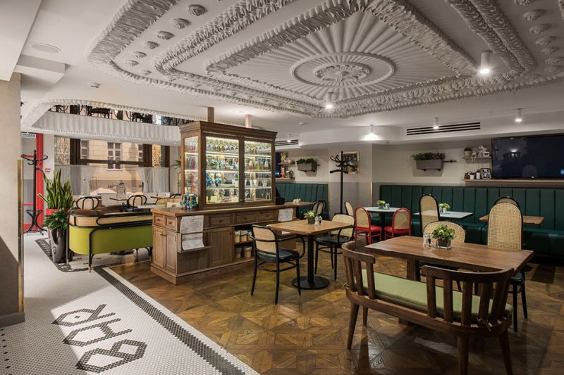 Кафе площадью 320 кв. метров разместилось в историческом здании на Большой Дмитровке. На потолке — лепнина, похожая на заварной крем. Большой дубовый буфет делит первый этаж на две зоны: у окна расположен кофе-бар, а в глубине зала находится более приватное пространство со столиками.
