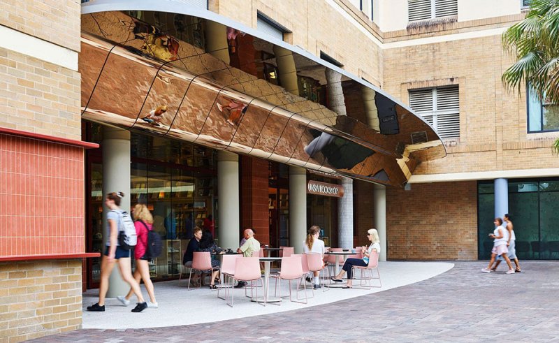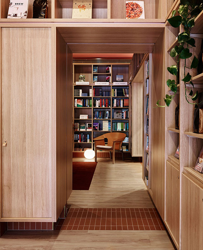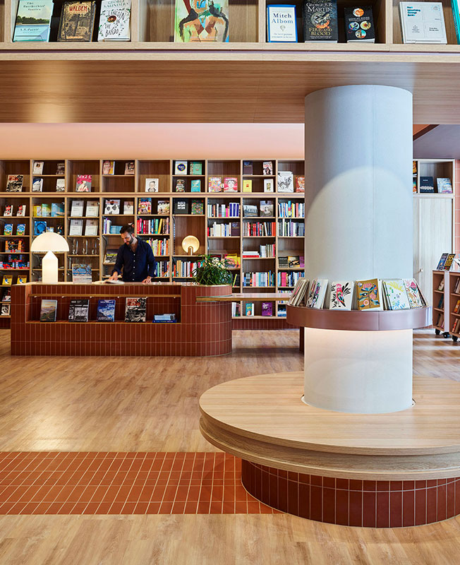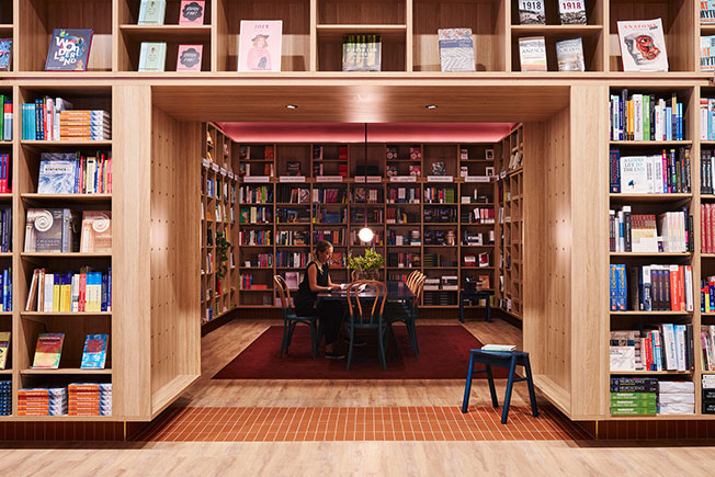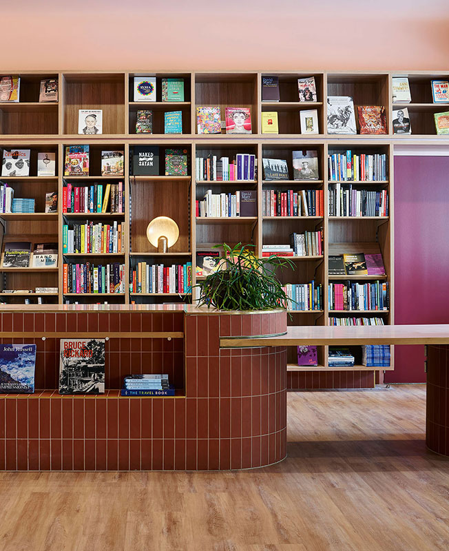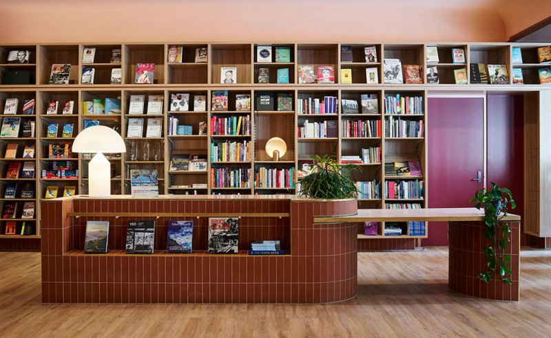 В южном Уэльсе, на территории университетского кампуса открылась модная библиотека и книжный магазин с зоной для отдыха и встреч. Нетипичное оформление с цветной сталью и плиткой разработала австралийская студия SJB. В отличии от большинства магазинов на территории университетских городков, NSW Bookshop представляется открытым пространством для бесед и приятных минут наедине с книгами. Магазин площадью 430 кв.м. состоит из трех смежных комнат, каждая из которых заполнена книжными полками, обшитыми древесиной. Изогнутый зеркальный тент из нержавеющей стали отражает открытую внешнюю площадку с розовыми стульями, вымощеную мраморной прямоугольной плиткой. Внутри есть большая зона для мероприятий, а также небольшие уголки для чтения и работы. За арочным проемом расположена небольшая кофейня. Темные оттенки розового и синего пересекаются по всему интерьеру: бледно-голубая плитка покрывает стену за кофейной стойкой, деревянные стулья окрашены в темно-коричневый цвет, а потолок приобрел персиково-розовый оттенок.