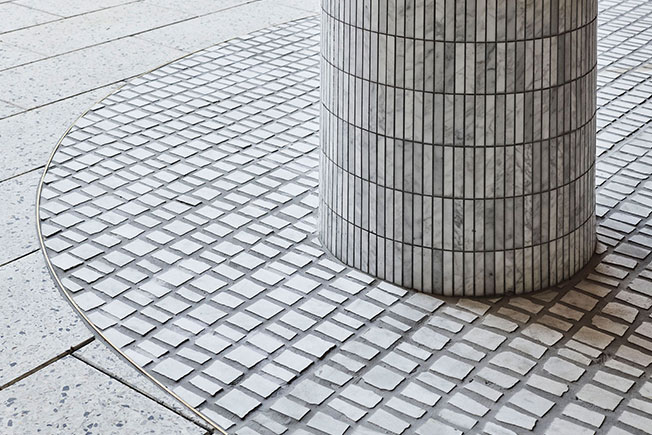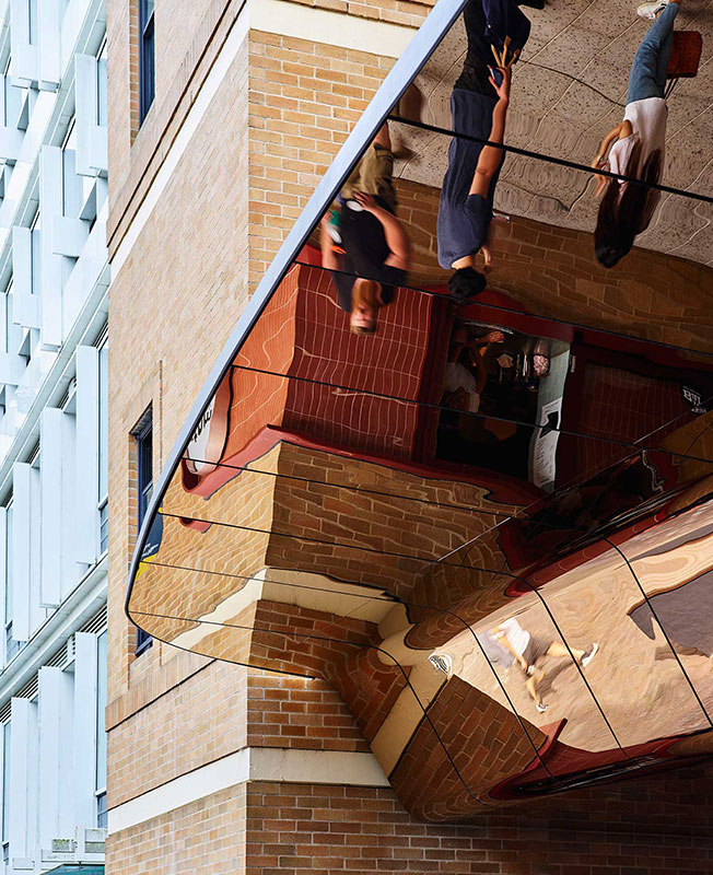 Изогнутый зеркальный тент из нержавеющей стали отражает открытую внешнюю площадку с розовыми стульями, вымощеную мраморной прямоугольной плиткой.