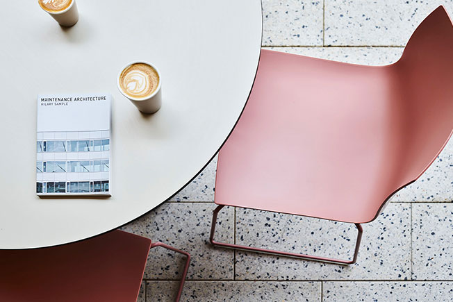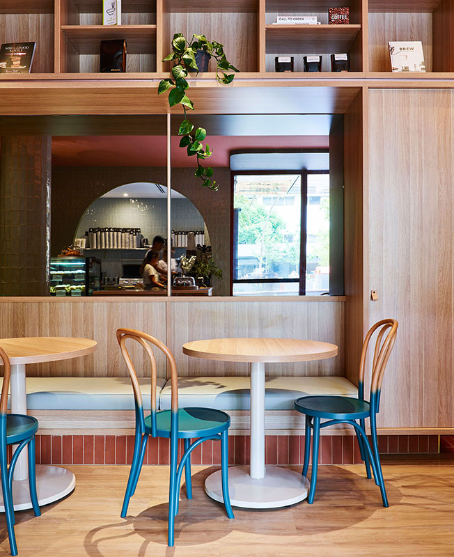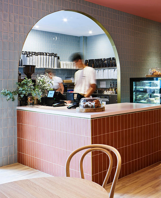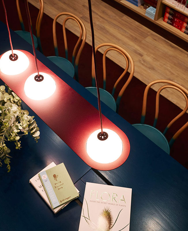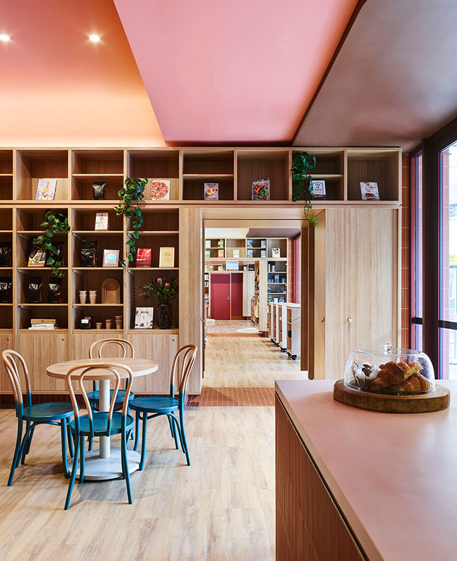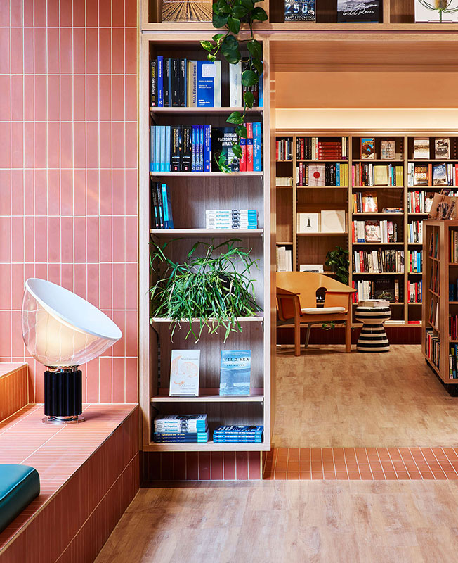 Внутри есть большая зона для мероприятий, а также небольшие уголки для чтения и работы. За арочным проемом расположена небольшая кофейня. Темные оттенки розового и синего пересекаются по всему интерьеру: бледно-голубая плитка покрывает стену за кофейной стойкой, деревянные стулья окрашены в темно-коричневый цвет, а потолок приобрел персиково-розовый оттенок.