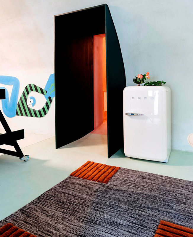 Двухкомнатная квартира площадью 65 кв.метров расположена на первом этаже. В квартире есть небольшая гостиная-кухня, спальня и ванная комната. Среди предметов интерьера есть культовые вещи от компаний Smeg, Cole, Karpeta и Foscarini. Но главной особенностью интерьера стали оригинальные произведения современного искусства авторства молодого итальянского художника Олимпии Загноли.