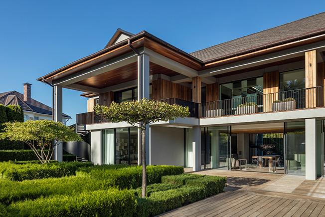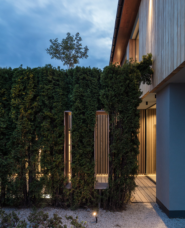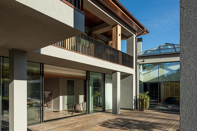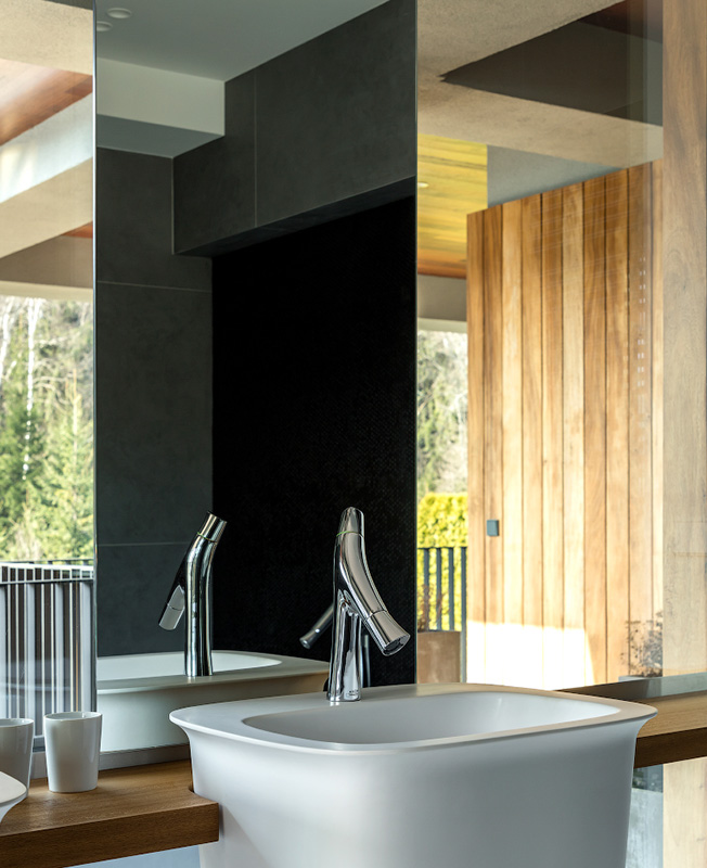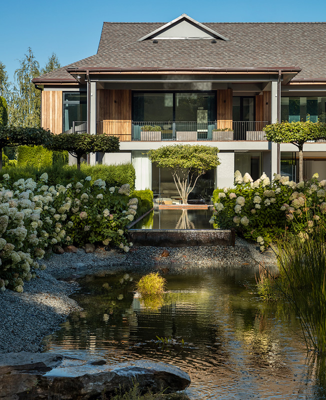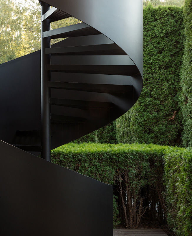 4a Architekten — немецкое бюро с головным офисом в Штутгарте и филиалом в Москве. «В России мы стараемся работать так, как делали бы это в Германии», — говорит руководитель московского отделения Александр Шамне. Новый проект — реконструкция подмосковного дома площадью 730 кв. метров. Он опубликован в журнале ИНТЕРЬЕР ДИЗАЙН. Апрель/май 2019. Уже сложившийся ландшафт адaптировали в соответствии с изменениями, которые происходили с домом: 4a Architekten работали совместно со швейцарской компанией Greenhance. Загородный дом — сложный организм. И если с самого начала доверить его опытному профессионалу, многих проблем удастся избежать. Этот дом хозяин построил несколько лет назад. В детали процесса особо не вникал, хотел закончить побыстрее. И лишь прожив здесь некоторое время, понял: многое надо было бы сделать по-другому. Не устраивало то, как было организовано пространство, мешали проблемы с инженерными коммуникациями, прежде всего с кондиционированием и вентиляцией. И тогда владелец обратился в 4a Architekten. Архитекторы Александра Филатова и Александр Шамне. Архитекторы перекроили постройку, по образному выражению Александра, «вывернули ее наизнанку». Оставили несущий каркас, все остальное — создали заново. Перенесли входную группу на другую сторону дома, демонтировали перекрытия, перенесли и «разбили» лестницу, создав новые проемы: лестничный пролет с первого на второй этаж расположили в одном месте, со второго на третий — в другом. Архитекторы сохранили на фасаде комбинацию деревянной облицовки и штукатурки, однако использовали эти материалы в иных пропорциях, отчего здание приобрело более современный вид. Скульптурную винтовую лестницу спроектировали архитекторы 4a Architekten. В результате полностью реорганизовали пространство и решили проблемы логистики. «Где-то убирали, где-то пристраивали, двигали, увеличивали — в итоге заказчик получил совершенно другой дом, современный, эргономичный». К опен-спейсу примыкает спа-зона — место для отдыха обставлено мебелью Paola Lenti. Cветильник Luceplan. Увеличенные оконные проемы объединили интерьер с природой. К опен-спейсу примыкает спа-зона — место для отдыха обставлено мебелью Paola Lenti. Cветильник Luceplan. Раздвижные конструкции объединили интерьер с природой. Зона спа. Занавес с подсветкой — разработка архитекторов, создает расслабляющую атмосферу. Лежаки Paola Lenti. Столовая. Cтулья Cassina. Люстра Moooi. Стол — собственность заказчика. Почти на всем первом этаже потолок закрыт деревянными рейками. Они скрывают инженерные коммуникации и одновременно играют роль декора. Кухня Leicht. Кухня — часть опен спейса на первом уровне. Кухонная мебель Leicht. Смеситель Hansgrohe. Помимо планировки, архитекторы изменили фасады, значительно увеличив оконные проемы. «Перед нами стояла задача объединить интерьер с экстерьером, все-таки это загородный дом: даже находясь внутри, важно чувствовать, что ты на природе». Раздвижные конструкции швейцарской компании Sky-Frame позволяют полностью раскрыть первый этаж, так что летом гостиная объединяется с садом. В интерьере преобладает мебель B