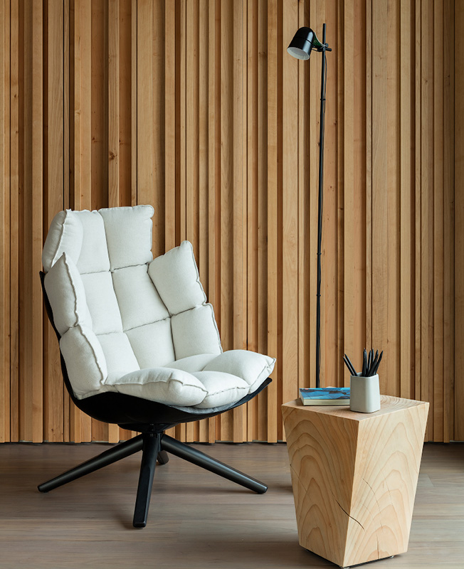Фрагмент спальни. Отделка стены набрана из деревянных реек. Кресло Husk, диз. Патрисии Уркиолы для B&B Italia. Столик Riva 1920.