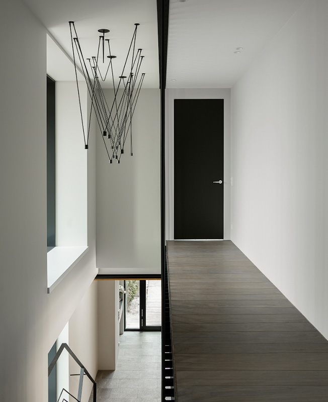 Вид из гостиной в сторону спа-зоны. На полу доска из ореха Ebony and Сo. Встроенный свет Modular. На переднем плане светильник, диз. Ольга Энгель.