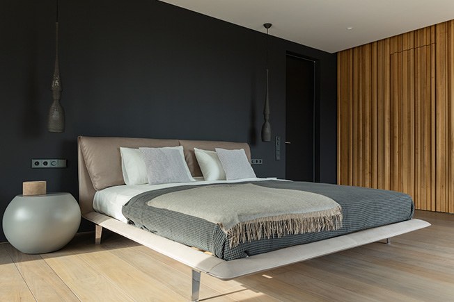 Главная спальня. Декоративная стена набрана из реек, если присмотреться, в ней можно различить дверь. Кровать Poltrona Frau, тумба-шар Meridiani.