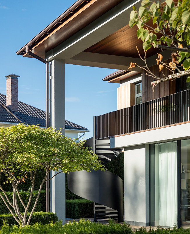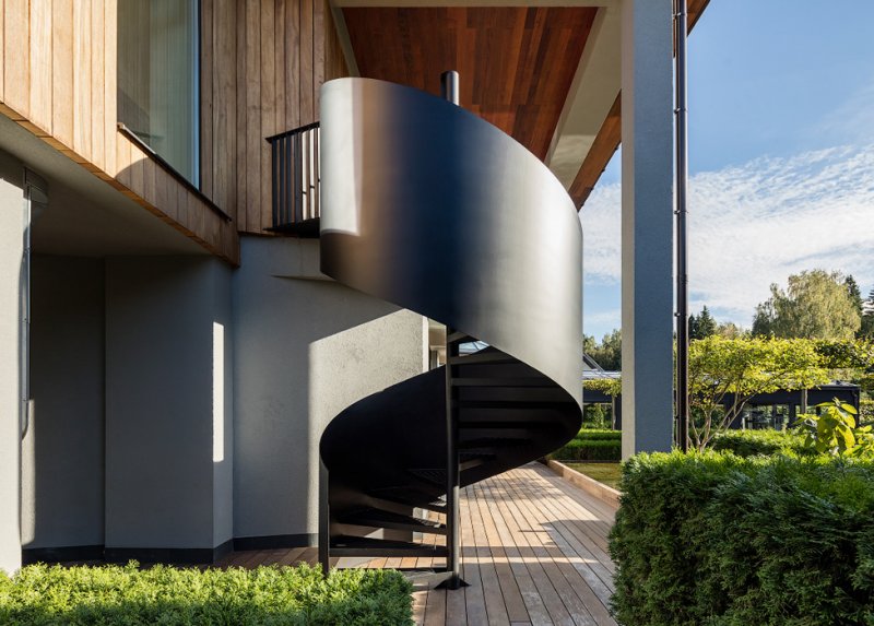 «Мы работаем в современном стиле, — говорит Александр Шамне. — Стараемся использовать натуральные материалы и не соединять слишком много разных». Деревянный реечный потолок почти на весь первый этаж придает нейтральному, в оттенках серого, интерьеру уют и тепло, а также скрывает инженерные коммуникации и встроенный свет.