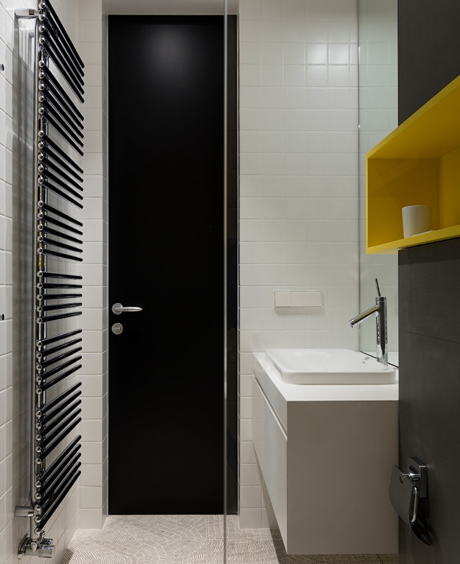 Cанузел при детской на втором уровне — в его интерьер архитекторы добавили цвет. Сантехника Antoniolupi. Смесители AXOR Hansgrohe.