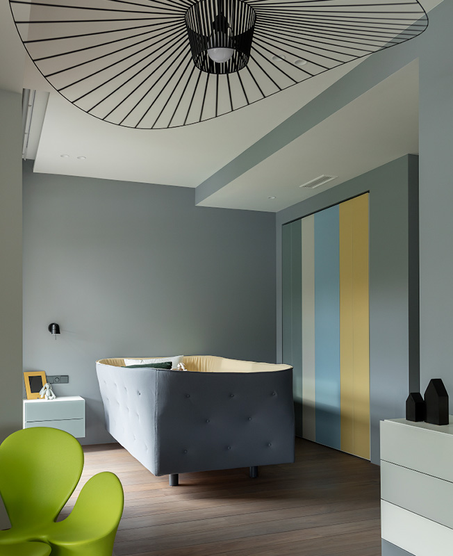 Просторная детская появилась в результате объединения двух комнат. Кровать, шкаф и комод Lago. Кресло-цветок, диз. Рон Арад для Driade. Люстра, диз. Констанс Гиссе, Vertigo — похоже, это первый случай использование знаменитой модели в детской комнате.