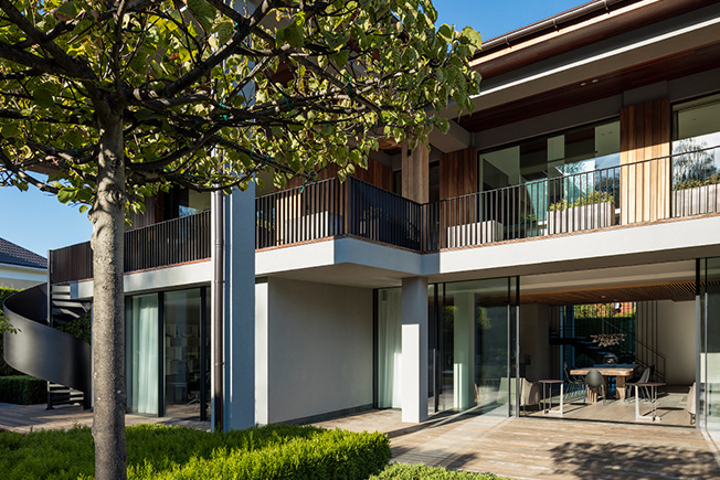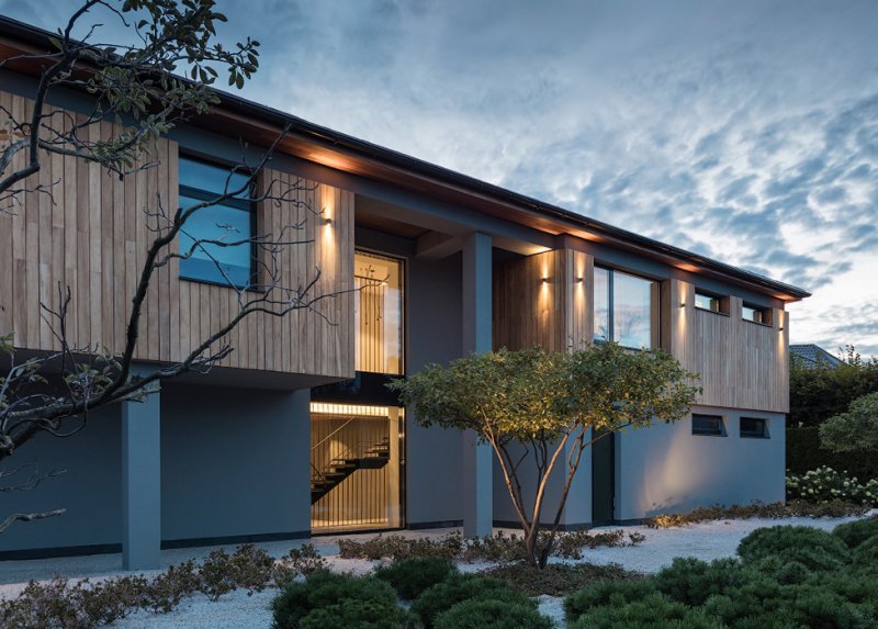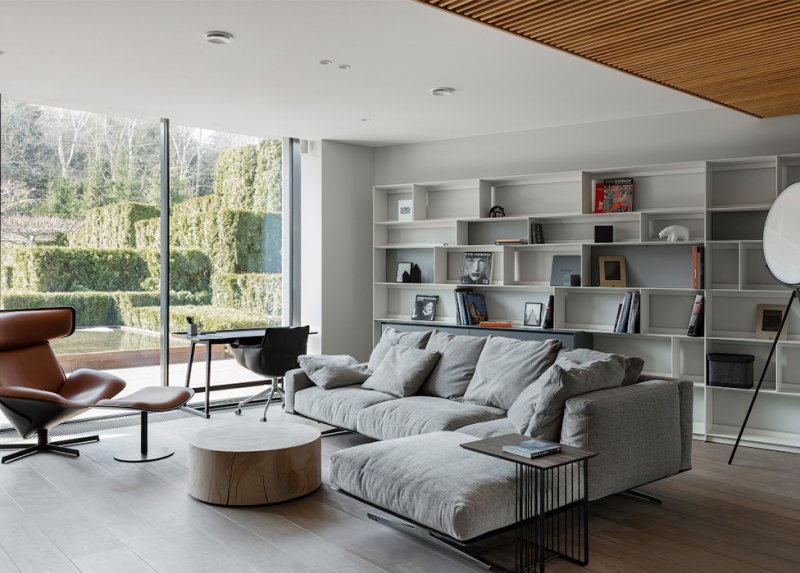 Раньше, несмотря на достаточное количество окон, дом выглядел замкнутым и несовременным: мешало плотное членение с тяжелыми профилями — их заменили на передовые окна швейцарской фирмы Sky-Frame. Постройка открылась в сторону сада, а летом и вовсе, благодаря 10-метровой раздвижной конструкции, первый этаж объединяется с ландшафтом в одно целое. В комнатах стало намного светлее: через новые окна внутрь дома проникает гораздо больше солнца.