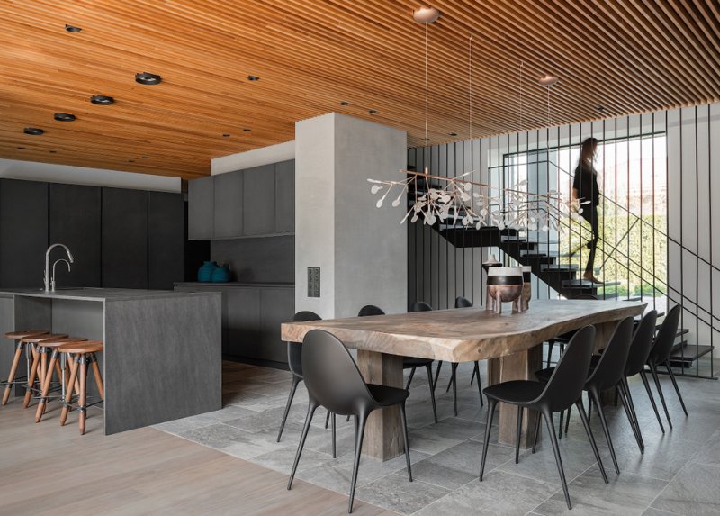 На первом уровне расположено объединенное пространство кухни-столовой-гостиной. Стулья Cassina, кухня Leicht. Люстра Moooi. Потолок закрыт деревянными рейками. Они скрывают инженерные коммуникации и одновременно играют роль декора.