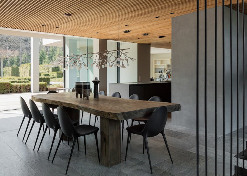 Почти на всем первом этаже потолок закрыт деревянными рейками. Они скрывают инженерные коммуникации и одновременно играют роль декора. Кухня Leicht.