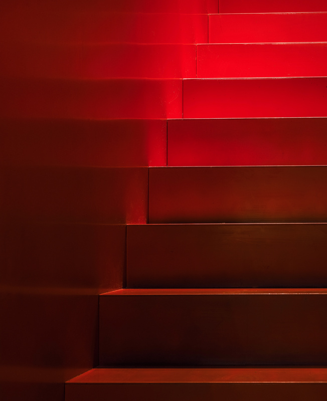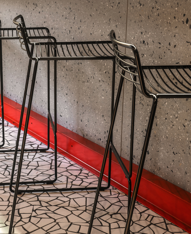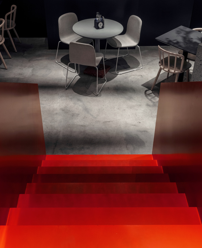 Смысловым центром цокольного уровня и визуальной доминантой всего пространства стала эффектная красная лестница, напоминающая арт-объект. Также в духе тенденции instagram ready над лестницей установили зеркало для запоминающихся селфи.