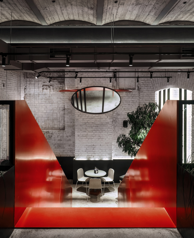 Авторы проекта сохранили и подчеркнули аутентичность пространства. Открытые арочные окна акцентированы графичными металлическими конструкциями, историческая кирпичная кладка выкрашена в светлый оттенок, а сводчатый потолок выделен архитектурным освещением.