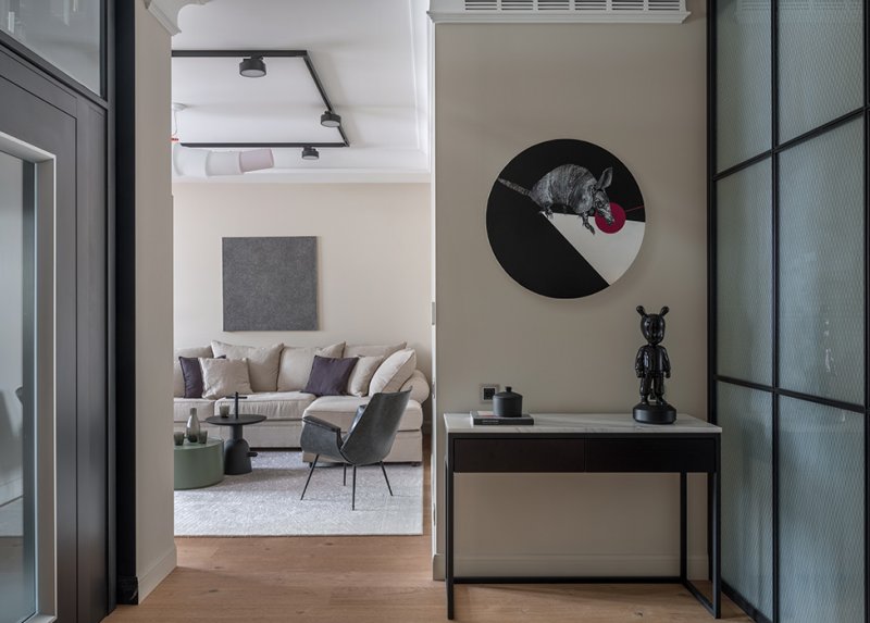 Вид из прихожей в гостиную. Консоль: «Тринита Интерьер». Статуэтка, диз. Хайме Айон, Lladro. На стене картина Алены Шаповаловой «Жажда», галерея «Агентство. Art Ru». Встроенные шкафы выполнены компанией Attribute.