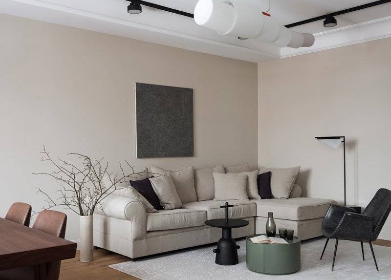 Гостиная. Диван — собственность заказчиков — перетянули бельгийским льном. Столики: Cassina и Novamobili. Кресло: винтаж, магазин Repeat Story. Торшер Kelly Wearstler, Visual Comfort Gallery. На стенах краска Benjamin Moore. Люстра Artemide. Арт: галерея «Агентство. Art Ru».