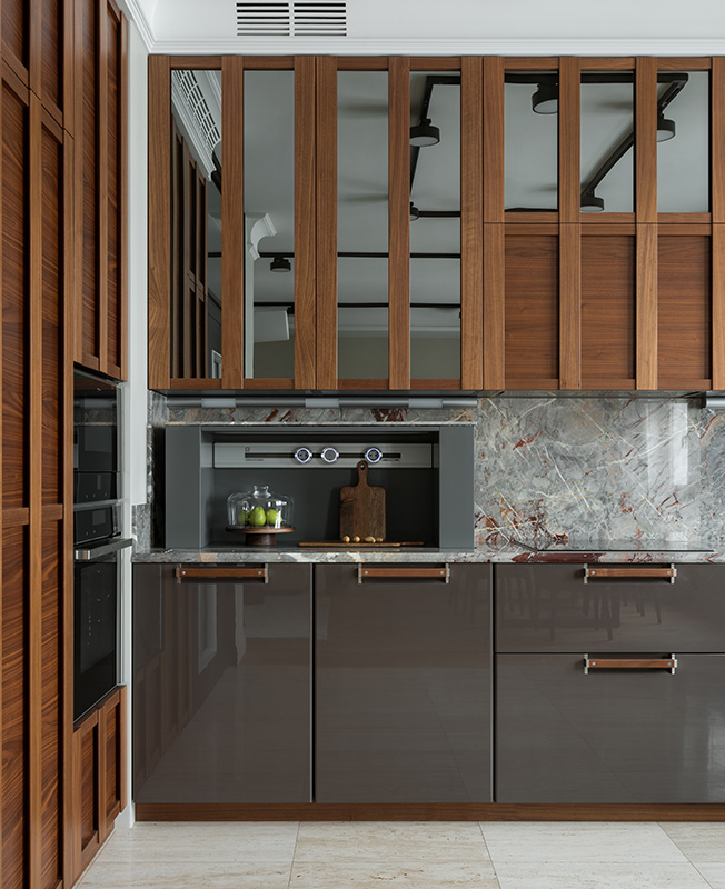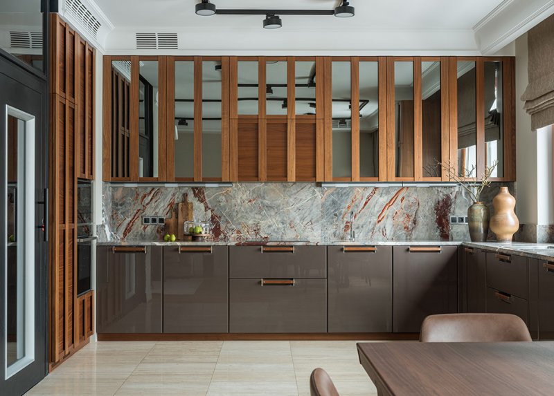 Сама кухня продумана до мелочей — хозяйка много готовит, и тут предусмотрено все, что ей необходимо. И вакууматор, и выдвижной стеллаж ретротоп, который поднимаем миксер, тостер и прочую мелкую бытовую технику, и встроенный «чайник» Dornbracht — система, которая подает из кухонного крана кипящую воду.