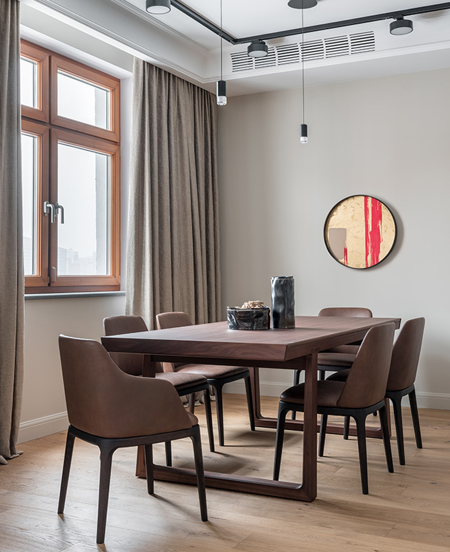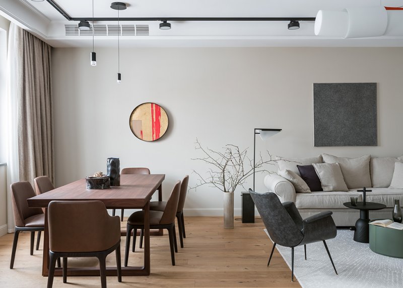 Столовая. Стол и стулья Poliform, «Тринита Интерьер». Над столом светильники Vibia. Напольное покрытие: доска Listone Giordano. На стене панно, магазин Predmety. Вазы Savour Design.