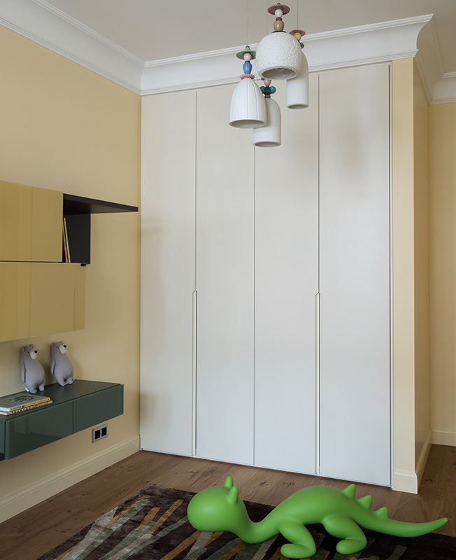 Уже когда свет в игровой-детской был выведен, заказчица влюбилась в люстры Mademoiselle испанской марки Lladro — это декоративные светильники, света практически не дают. Пришлось вписать их в светодиодные светильники казанского производителя. То есть собрали два светильника из четырех: теперь барышни отвечают за настроение, а светодиодные «бублики» — за освещенность, которая в детской по нормативам должна быть выше, чем в остальных помещениях.