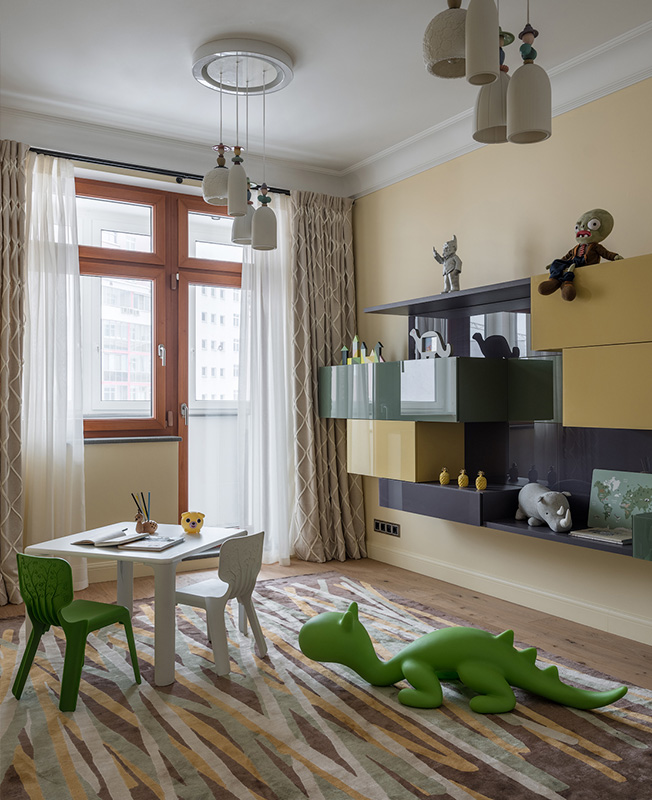 Детская спроектирована на вырост. Навесные комоды Lago. Cветильники Lladro. Ковер Art De Vivre.