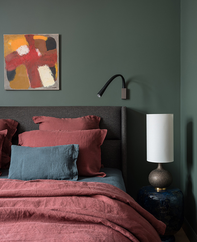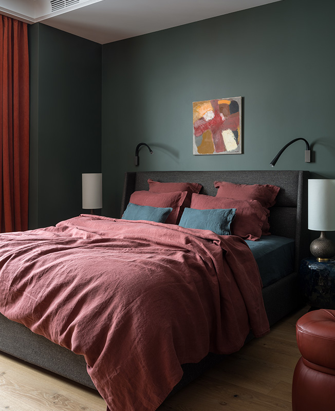 Спальня. Кровать Poliform. На стенах краска Benjamin Moore. Постельное белье Lissoy, магазин Predmety. Столики Savour Design. Лампы Visual Comfort Gallery. Пуф «Трио-Интерьер». Над кроватью работа Натальи Ситниковой, галерея «Агенство. Art Ru».