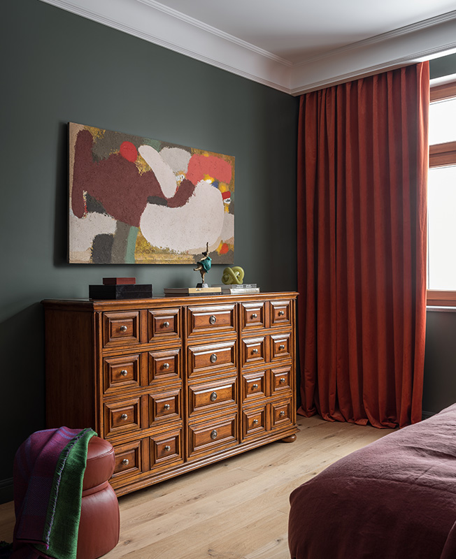 Спальня выдержана в насыщенных тонах. В новом интерьере нашел свое место любимый предмет хозяев — дубовый комод со множеством ящичков. Над ним картина Натальи Ситниковой «Осень», галерея «Агентство. Art Ru».