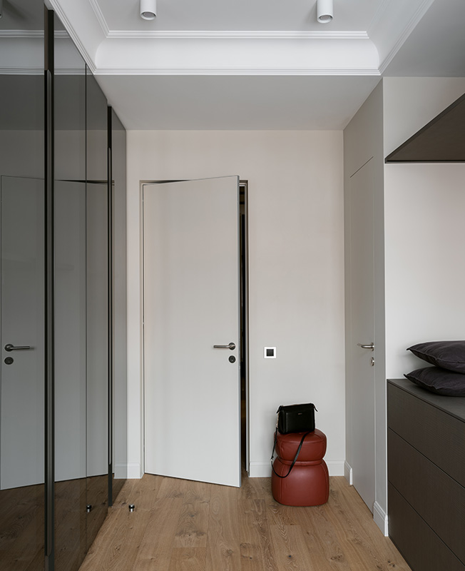 В качестве пуфа в прихожей используется приставной столик Poliform. «Практичность, насыщенный цвет и интересная форма заставили нас закрыть глаза на то, что по документам это стол, а не табурет», — говорит Юлия Куликова.