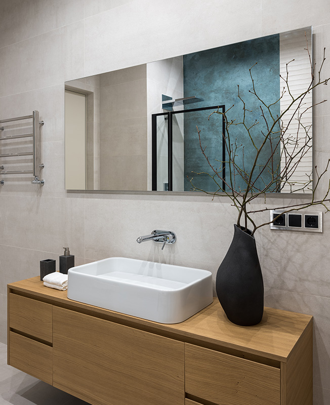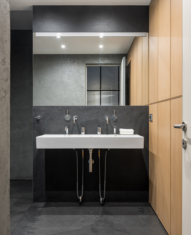 Чтобы в ванной смягчить холодный камень, шкаф во всю стену выполнен из натурального дуба. Внутри шкафа расположены розетки, позволяющие спрятать туда всю технику, которая необходима в санузле. Две розетки выведены рядом с раковиной на панели, которая повторяет створки шкафа, но не открывается. Для хозяйского мейнкуна в нижней части одного из шкафов в прихожей предусмотрен собственный туалет — со светом и смывом».