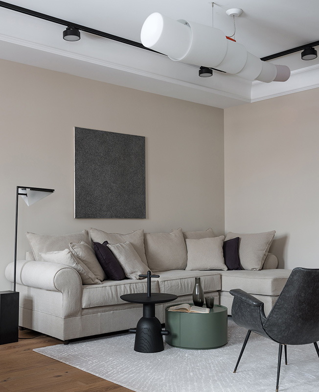 Гостиная. Диван — собственность заказчиков — перетянули бельгийским льном. Столики: Cassina и Novamobili, «Трио-Интерьер». Кресло: винтаж, магазин Repeat Story. Торшер Kelly Wearstler, Visual Comfort Gallery. На стенах краска Benjamin Moore. Люстра Artemide. Арт: галерея «Агентство. Art Ru». Ковер Art De Vivre. графин и стакан DesignBoom