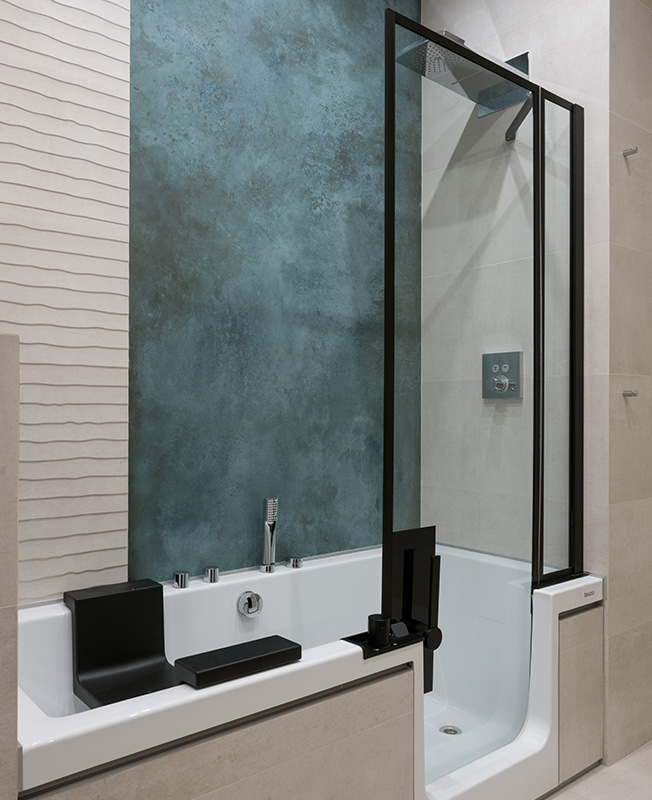 Детский санузел сделан на вырост, поэтому сдержан по дизайну. Самый яркий акцент — бирюзовый керамический слэб на стене. Ванна — с дверцей, чтобы маленькому ребенку было удобно заходить в нее самостоятельно.