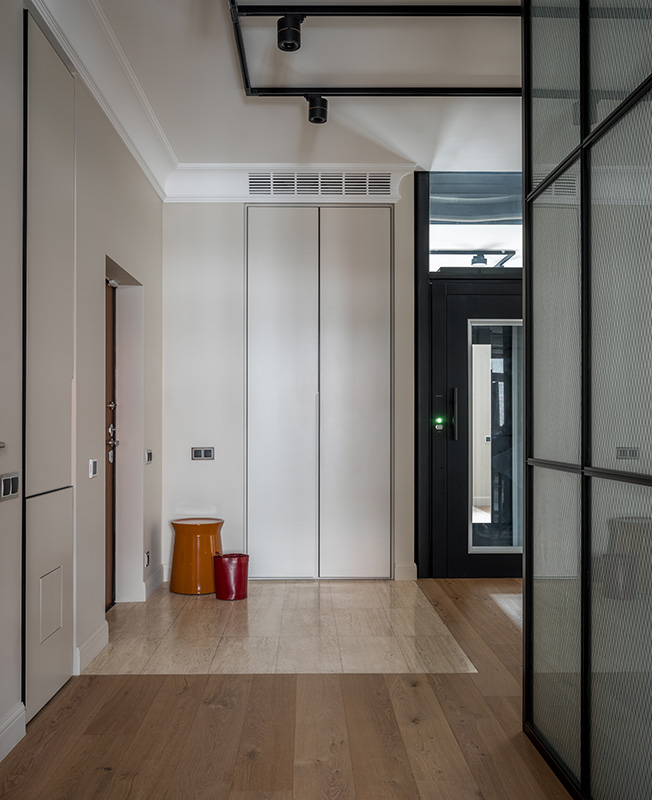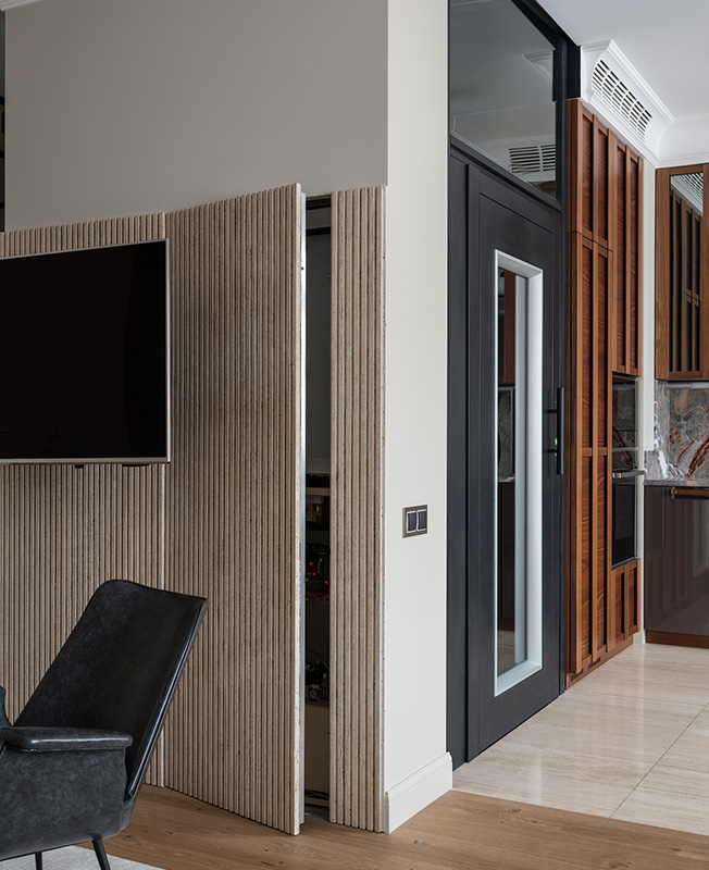 «Лифт, соединяющий две квартиры владельцев, был важным узлом при создании планировки, — рассказывает Юлия Куликова. — Не только потому, что он определил конфигурацию кухни и гостиной, но и потому что требовал рядом с собой размещения электропривода и, соответственно, люка, который обеспечивает доступ к оборудованию.