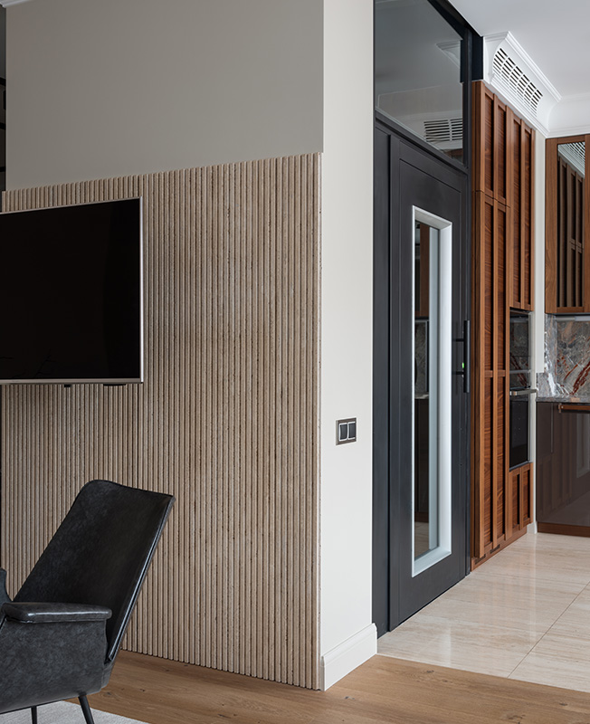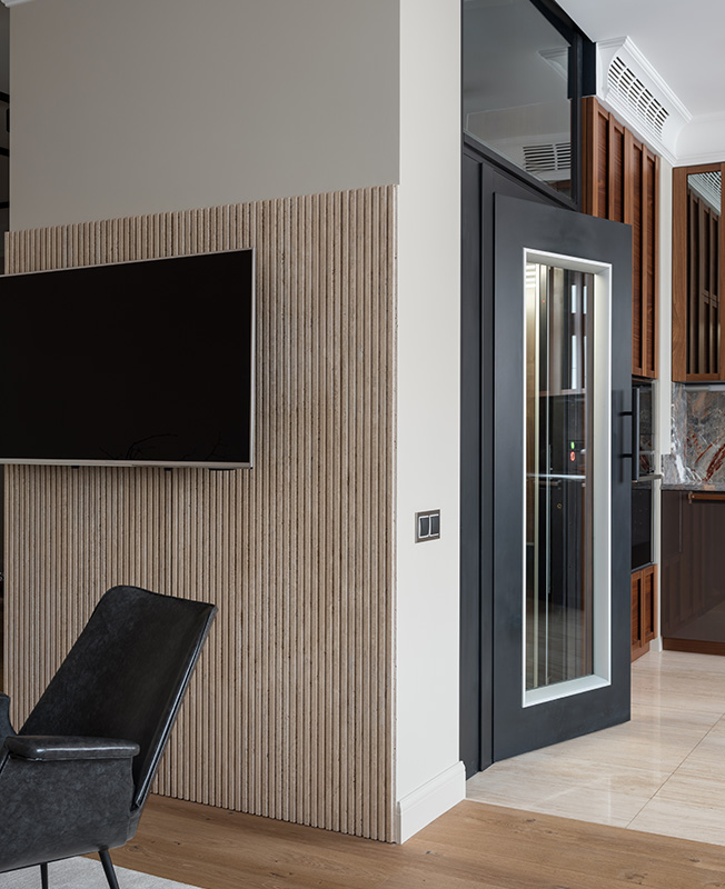 Лифтовой люк оставили на самом видном месте — за телевизором, напротив дивана. Чтобы его замаскировать, сделали рифленую панель из цельной плиты травертина в высоту люка.