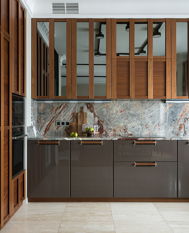 В итоге люк решили оставить на самом видном месте — за телевизором, напротив дивана. Чтобы его замаскировать, сделали рифленую панель из цельной плиты травертина в высоту люка. Найти производство, согласившееся вырезать прямоугольные желобки, было не просто, но мы нашли. Рассчитали до миллиметра вырезы — и сделали. Пол на кухне и в прихожей также выложен натуральным травертином.