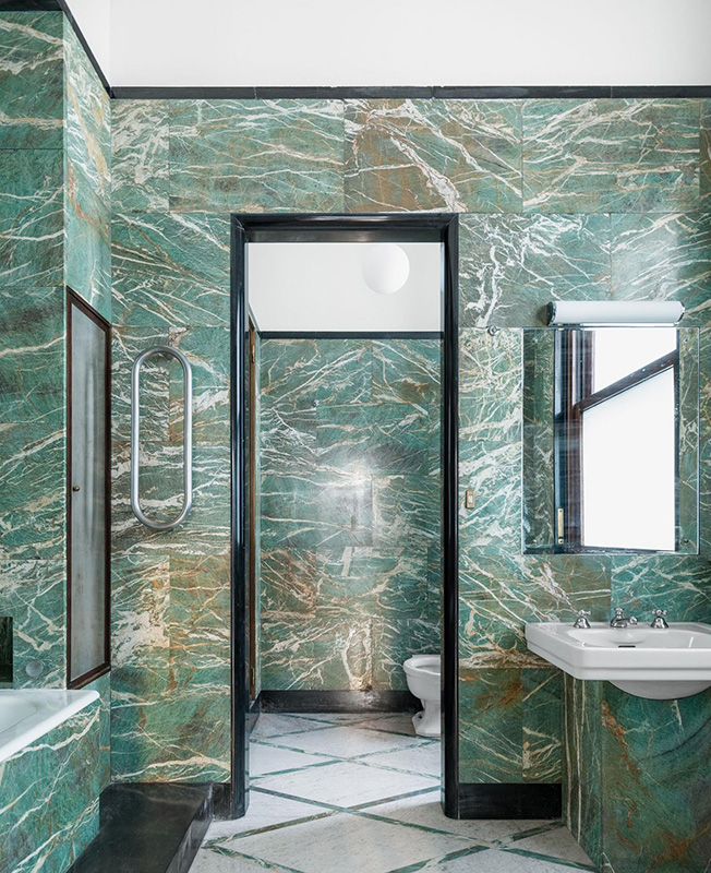 Богатый орнаментом интерьер представляет собой альтернативу типичному белому галерейному кубу. Студия Binocle позаботилась о том, чтобы отремонтировать оригинальную темперную живопись в коридоре. Самые невероятные помещения — бывшие ванные комнаты владельцев: с отделкой из розового мрамора орнавассо и редкого бирюзового мрамора верде чаллант. Один из самых знаковых элементов дома — винтовая лестница. Аналогичная была спроектирована Порталуппи совместно с группой BBPR для Миланской триеннале 1933 года. Здесь архитектор установил ее, чтобы семья имела прямой доступ в сад.