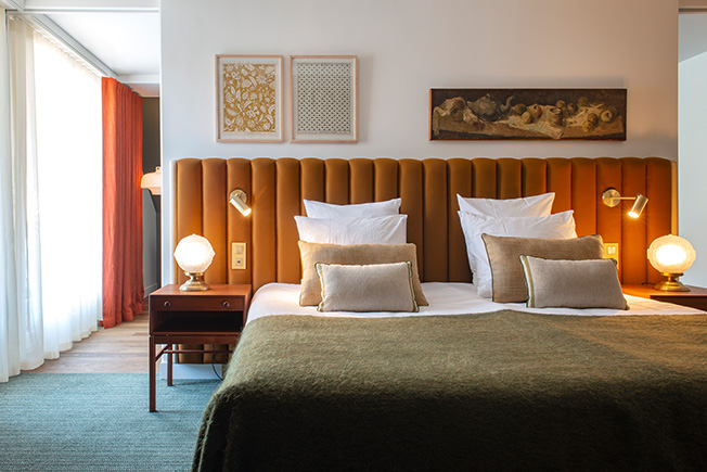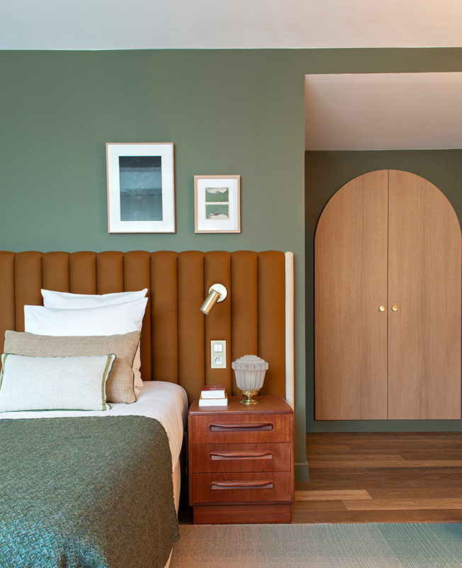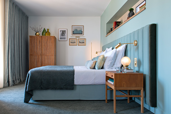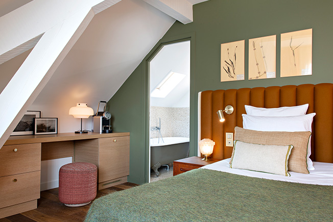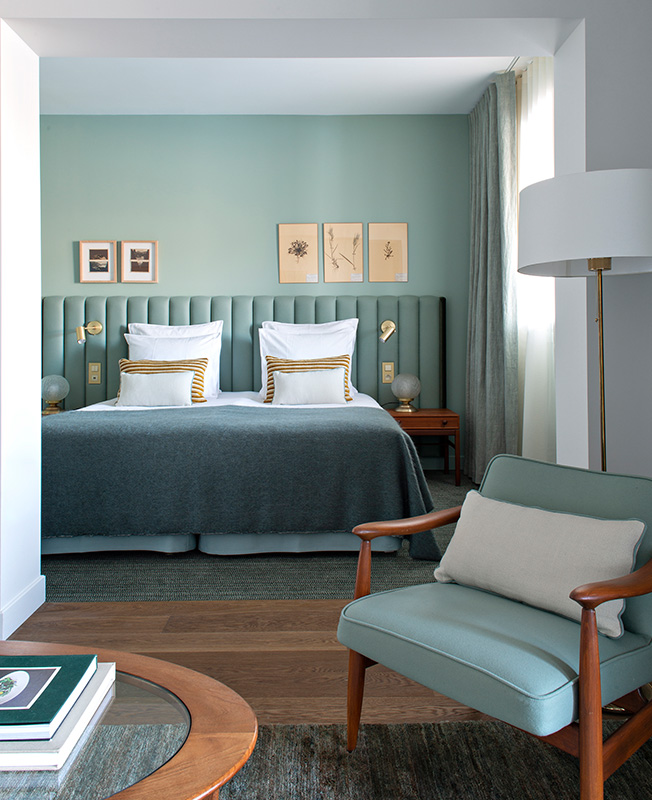 Естественные цвета обретают смысл рядом с пейзажем. В каждом номере и люксе есть элегантное сочетание старого и нового, которое выглядит очень актуально, не будучи в тренде. Выбор Бонавентур — старинные обои, антикварное опаловое стекло, фактурный текстиль от Pierre Frey.