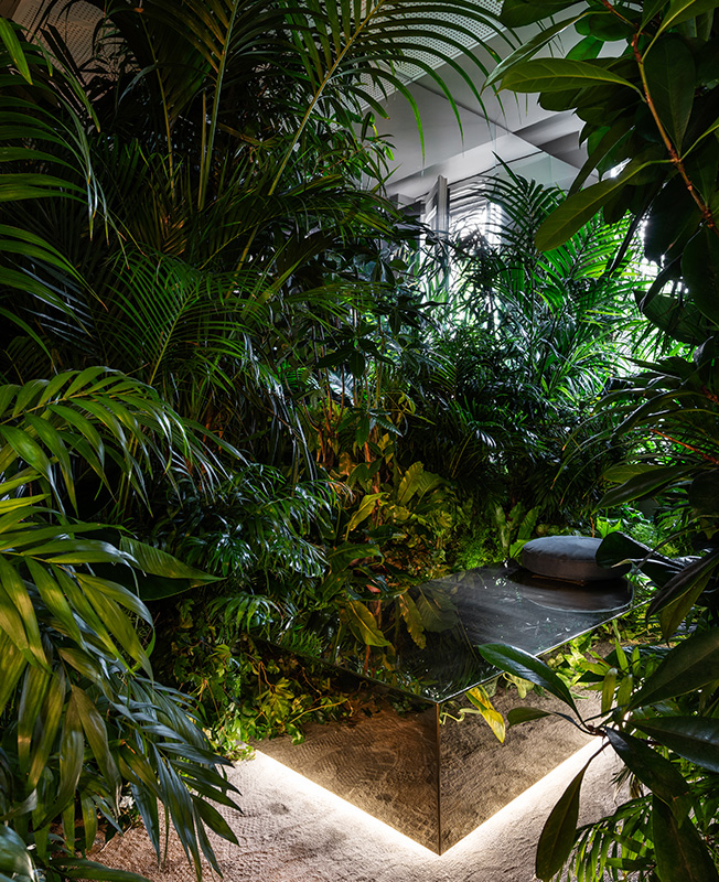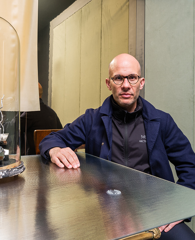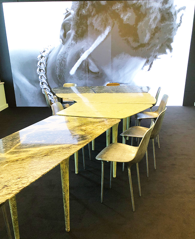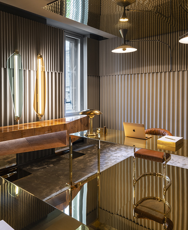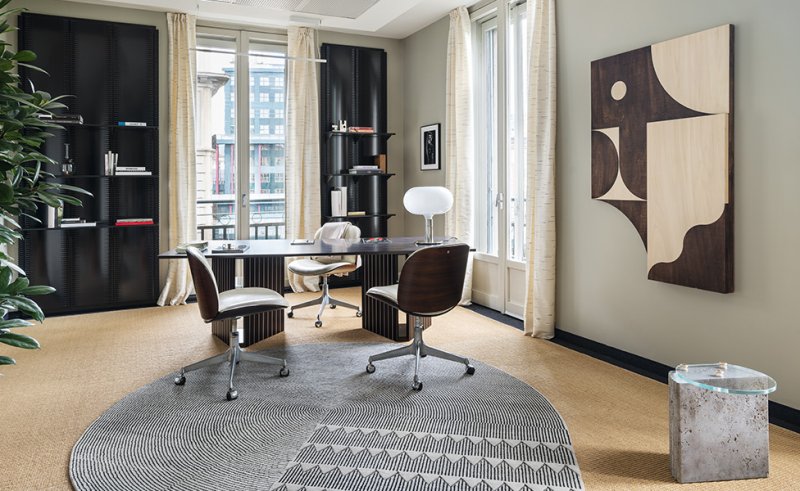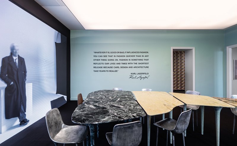 «Моим вдохновением стал знаменитый Desert de Retz — архитектурный парк недалеко от Парижа. Это место, которое говорит о сближении разных миров и культур. В переговорной я использовал зеленую палитру, чтобы выразить идею dejeuner sur l'herbe («завтрака на траве») через мой стол Garda, выполненный в мраморах зеленых отттенков. Стулья ML 1.2, я создал из алюминия и вулканического камня.