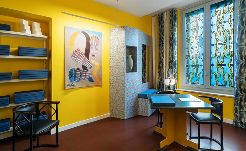 Стены длинного коридора оформлены обоями с оригинальным рисунком дизайнера. В комнате витраж фильтрует и окрашивает свет, который поступает с площади Пьяцца Кадорна через единственное окно. С тонкими ссылками на Мемфис, используя ламинат с принтом по его собственным рисункам, Пьер Мари представляет себя молодым декоратором, покоряющим своей креативностью Милан.