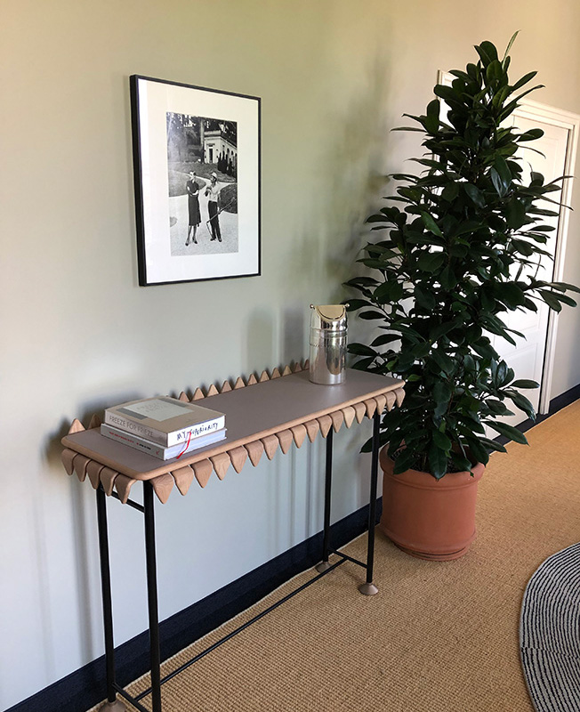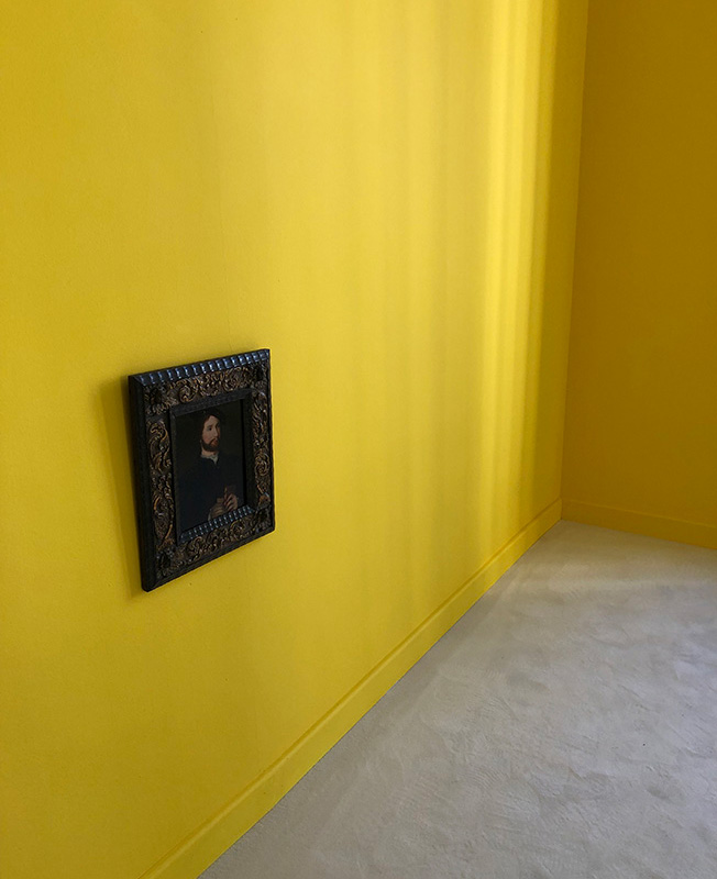 Элегантный и простой стол из дуба расположен в центре, на плюшевом ковре кремового оттенка. Его высота и расположение ставят под сомнение условности типичного офиса, как и то, где висит живописный портрет джентльмена, держащего том Петрарки (ок. 1530)».