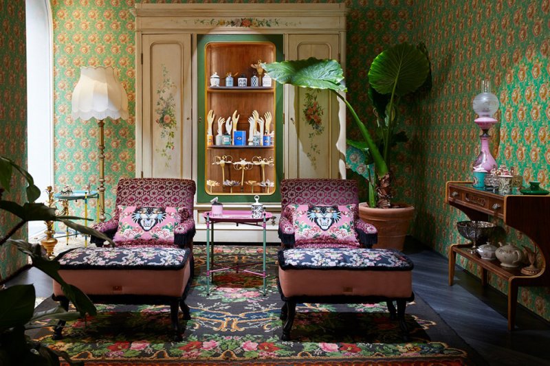 Коллекция Gucci Dеcor — это нарочитый максимализм во всем — от свечей до стульев, от тарелок до обоев. Она дебютировала недавно — в 2017 году. За это время дом Gucci стал настолько предан декору дома, что приобрел компанию Richard Ginori, вдохнув новую жизнь в историческую фарфоровую мануфактуру. Фабрика, которая находилась под художественным руководством Джо Понти с 1923 по 1933, сейчас производит весь фарфор, для постоянно пополняющейся коллекции Gucci.