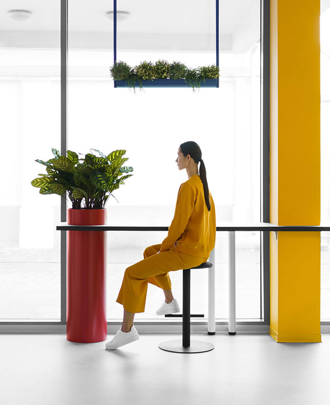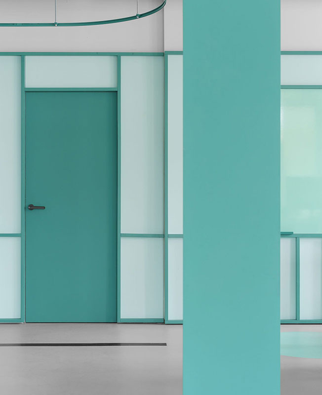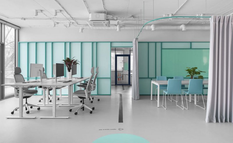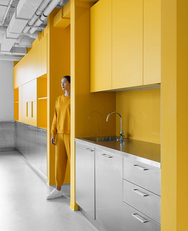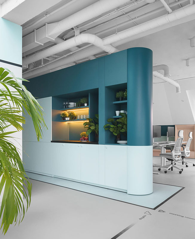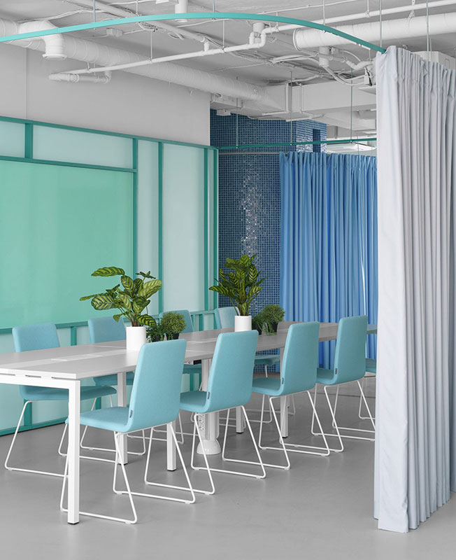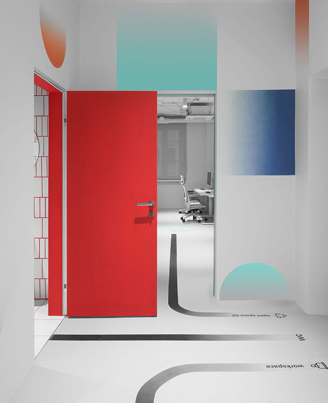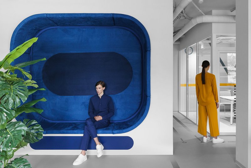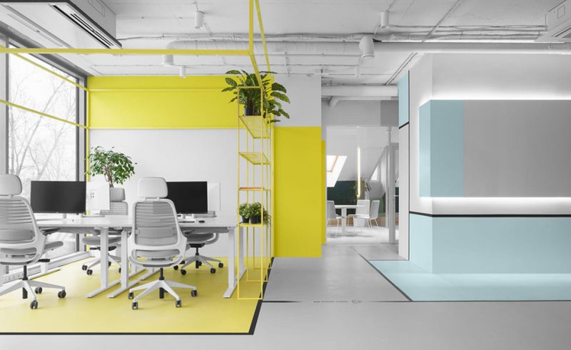 Белый цвет преобладает почти в каждой зоне, но благодаря ярким деталям и необычным формам стандартные элементы офиса приобретают новое значение. Авторы проекта черпали вдохновение в графике и палитре Пита Мондриана при создании цветовой композиции помещений.