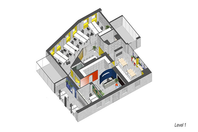 Молодая компания заказала команде Studio11 офис cо множеством цветных и графических деталей. Пространство площадью 1000 кв. метров занимает пять этажей, включая цокольный этаж, террасу и внутренний двор.
