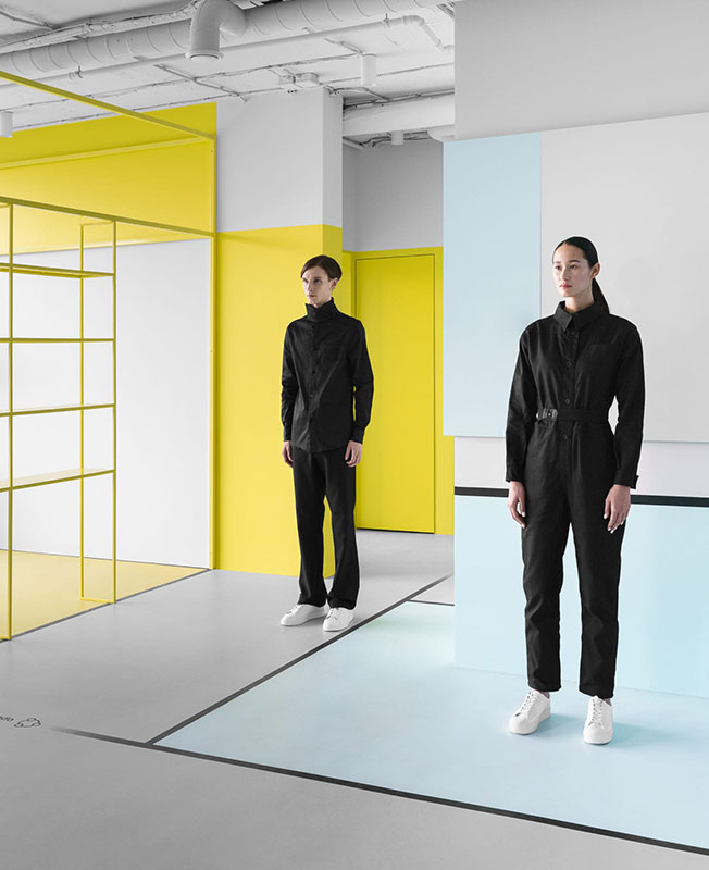 Черная графика на полу и стенах служит в качестве «навигационной системы» — минималистичные указатели и обозначения продолжают стилистику мобильного приложения компании.