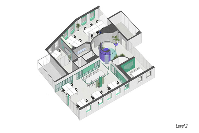Каждый рабочий этаж с открытой планировкой оснащен обеденной зоной, гостиной и комнатами для совещаний. На открытой террасе есть бар с видом на центр города, а на первом этаже зона отдыха с массажным кабинетом, столом для пинг-понга и неформальным конференц-залом.