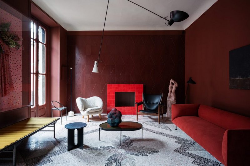 Узорная, зачастую трехмерная керамическая отделка в квартире становится не просто декоративной деталью, но настоящим структурным элементом, подобно колоннам у входа или каминному порталу. Эффект усиливает выразительная палитра. «Мне нравится работать с контрастами, — говорит Элиза Оссино. — Цветовая гамма включает очень темные, непрозрачные тона: зеленый, теплый коричневый, темно-синий, а также акценты красного цвета. Они чередуются с очень чистыми светлыми пространствами».