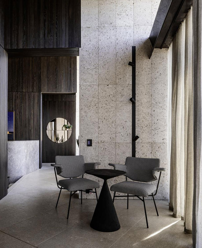 Умышленно темный и угрюмый фасад из бетона и известняка, отделан мореным дубом и деталями из меди. Обожженое дерево, пепельно-серый мрамор и латунь, использованы в интерьерах, над которыми трудился дизайнер Хекер Гатри.