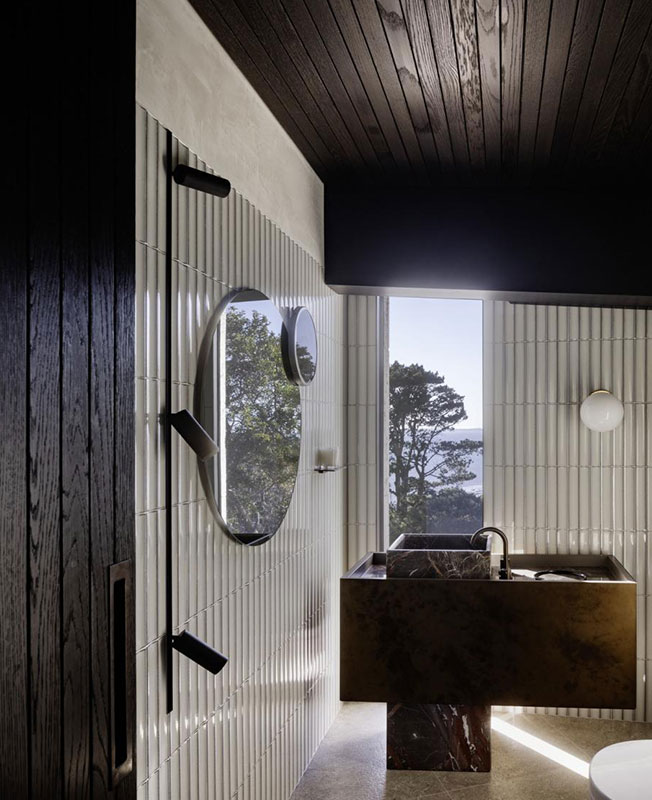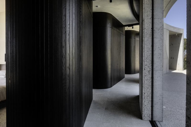 Архитектор Ник Каралис, Woods Bagot спроектировал дом на австралийском побережье. Tidal Arc House стоит на откосе, на полуострове Морнингтон, в небольшом городке к юго-востоку от Мельбурна, с населением около 900 человек. Кажется, что этот странный дом, свернулся на склоне как улитка. Почти эпический топографический контекст и роскошные морские виды окружают постройку, предназначенную не для постоянного проживания, а для отдыха. В этом загородном доме в дополнение к главной спальне созданы еще три гостевые. Умышленно темный и угрюмый фасад из бетона и известняка, отделан мореным дубом и деталями из меди. Обожженое дерево, пепельно-серый мрамор и латунь, использованы в интерьерах, над которыми трудился дизайнер Хекер Гатри. «Сложность с приливами и движением солнца были решающими факторами», — cчитает Каралис. Вода подступает прямо к дому, скрывая большие коралловые рифы во время прилива. Просчитанная форма обеспечивает тень от заходящего на западе солнца, и открывает океан, чтобы впустить восход. Интерьеры позволяют жителям чувствовать воздействие местоположения. На самом верхнем уровне находятся крыло главной спальни и гостиная, которые отделены деревянной и каменной лестницей. Из гостиной открывается выход на южную сторону. Нижний ярус имеет две точки входа: на западе и востоке, последний соприкасается с круглым, внутренним двором, ведущим в другое жилое пространство, и с тремя изолированными комнатами для гостей, оформленными изогнутыми, выложенными деревом стенами. Внизу есть подземный подвал с винным погребом.