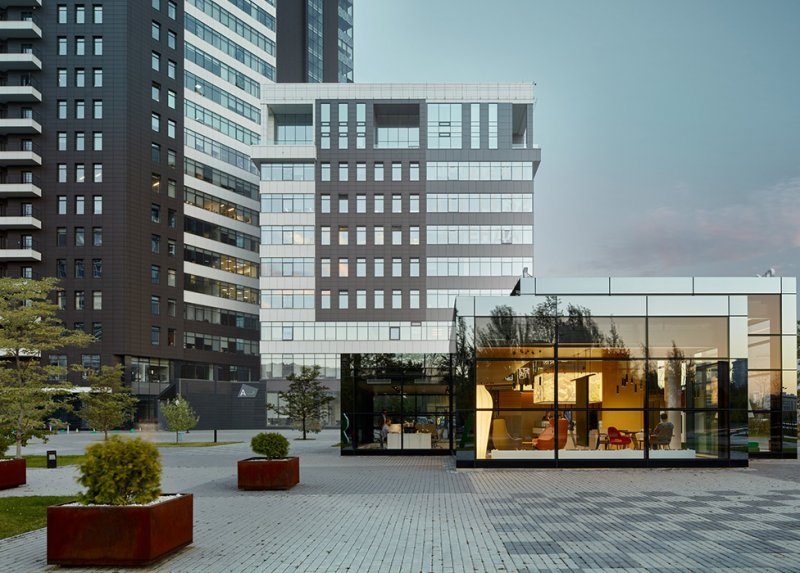Архитектурная студия Vox Architects спроектировала офис продаж жилого комплекса Clever Park. Авторы: Борис Воскобойников, Мария Ахременкова, Андрей Косков. Концепция проекта вдохновлена общей философией ЖК Clever Park — это своеобразный дом-мечты, при этом доступный и близкий. Комплекс стал для Екатеринбурга образцом качественного жилья. Офис продаж — точка притяжения новых жителей, место, где они могут воплотить мечту в реальность. Офис продаж выполняет сразу несколько функций: это и место встречи с потенциальными жителями квартала, и рабочее помещение, и место рекреации. Поэтому главной задачей для архитекторов стало правильное зонирование. Помещение представляет собой открытое пространство, визуально разделенное на несколько зон: рабочие места, бар, зоны для переговоров и встреч. Благодаря мобильным перегородкам и мебели пространство может трансформироваться под любую задачу. Общая площадь: 120 кв. метров. Проектировщики Vox Architects придирчиво подошли к выбору оснащения: использовали мебель бренда Vitra, cветильники Vibia, сантехнику Laufen. В центре офиса расположен модульный макет квартала, на котором в масштабе можно посмотреть, как выглядит Clever Park: жилые строения, детские площадки, набережная, ландшафтный парк с зонами отдыха. Полупрозрачный объем, растворяющийся в пейзаже, привлекает своей эфемерностью в светлое время суток и загадочно мерцает теплыми огнями вечером. Утром на фасадах играют солнечные блики, а когда стемнеет — здание практически растворяется, отражая на своих зеркальных гранях всю палитру заката. Масштабный проект Clever Park включает в себя нескольких компонентов: офис управляющей компании Альфа-Строй, входные группы, 4-этажное здание бизнес-центра, здание и интерьеры офиса продаж, интерьеры общественных зон, интерьеры квартир, навигация. Комплекс расположен на берегу реки Исеть, поэтому в задачу проектировщиков также входило благоустройство набережной с зоной отдыха. Перепады уровней, малые архитектурные формы, комбинированное освещение и озеленение — именно эти элементы формируют лицо квартала Clever Park. Комплекс уже получил престижные награды: European property awards и Urban Awards.