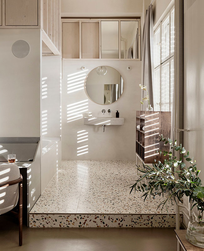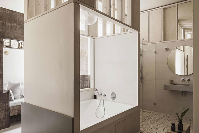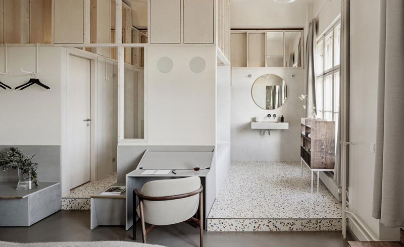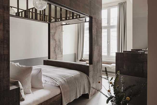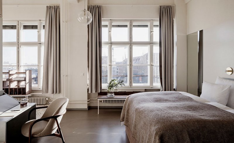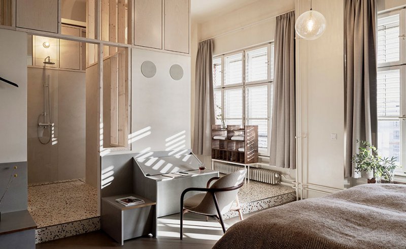 В правильных руках мягкий минимализм привносит в интерьер покой и современную эстетику. Лондонская студия Jonathan Tuckey Design и датский архитектор Сигурд Ларсен с успехом реализовали любимые приемы в своем последнем совместном проекте, обновив лобби и комнаты берлинского Michelberger Hotel. Открытый в 2009 году отель занимает бывшую световую фабрику рядом с мостом Обербаум. Его сдержанная эстетика была первоначально спроектирована дизайнером Вернером Айсслингером и дуэтом Аня Кнауэр и Сибилла Оллерих, которые включили мебель с барахолки и недорогие материалы во все интерьеры. Студия Джонатана Такея получила задание по созданию серии люксов на четвертом этаже. Номера оформлены в минималистском стиле, но в то же время «полны тепла, очарования и смирения». Дизайнеры использовали необычную планировку помещений с высокими потолками и стальными балками, чтобы создать многослойные светлые интерьеры из натуральных материалов. Гипсовые стены были соединены с полами грибного оттенка, а также с песочно-бежевыми шторами и покрывалами. Каркасы кроватей, стеллажи и боковые столы изготовлены из светлой фанеры Panerholz , которая выделяет природные смолы во время производственного процесса, придавая поверхности слегка изношенный внешний вид. Отобранные материалы должны были быть тактильными и с годами будут красиво стареть. Дополнительные окна, которые выходят на городской квартал Фридрихсхайн, были акцентированы, обеспечивая более естественное освещение в центре этажа. В лобби датский архитектор Сигурд Ларсен повесил ряд смелых люстр янтарного цвета, изготовленных Berlin Art Glas. Во второй раз Ларсен работал над Michelberger (он создал два гостевых люкса в отеле в 2015 году). Он заменил существующие кресла новыми низкими диванами на деревянном каркасе. Здание 1903 года имело открытую планировку и широкие окна, которые наполняют комнаты естественным светом. Авторы проекта умело проработали пространство добавив много зеркал, чтобы визуально расширить номера и создать иллюзию дополнительных комнат.